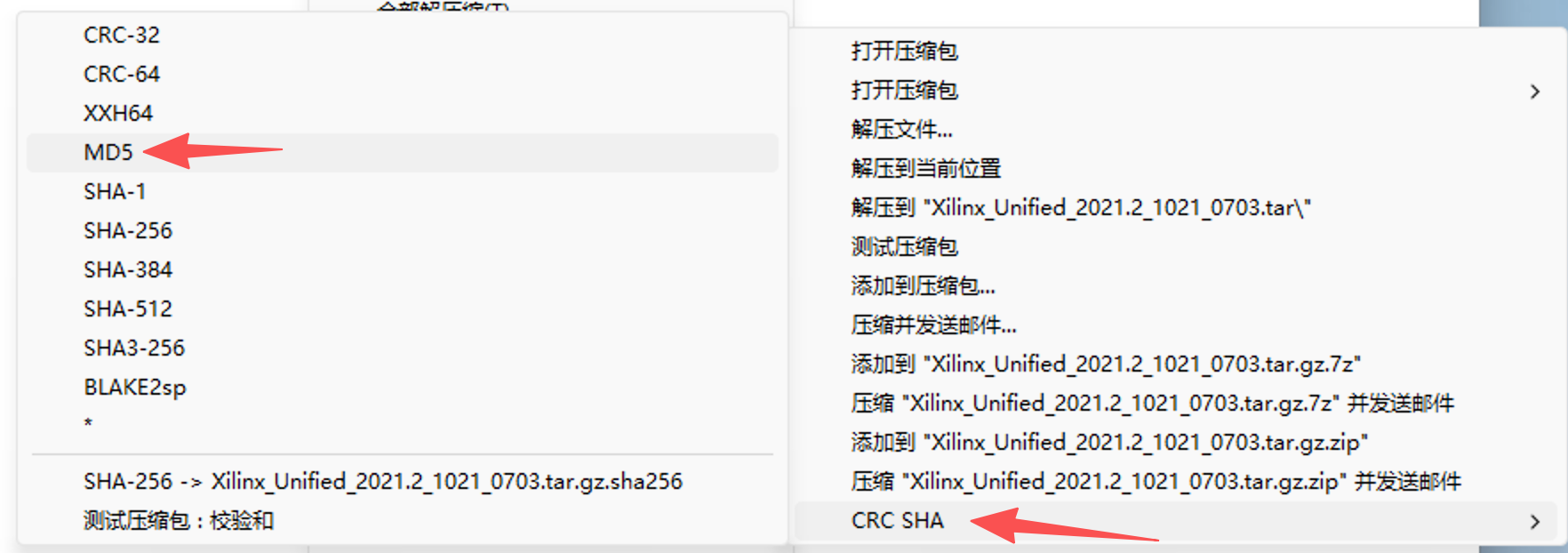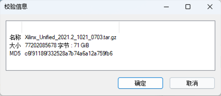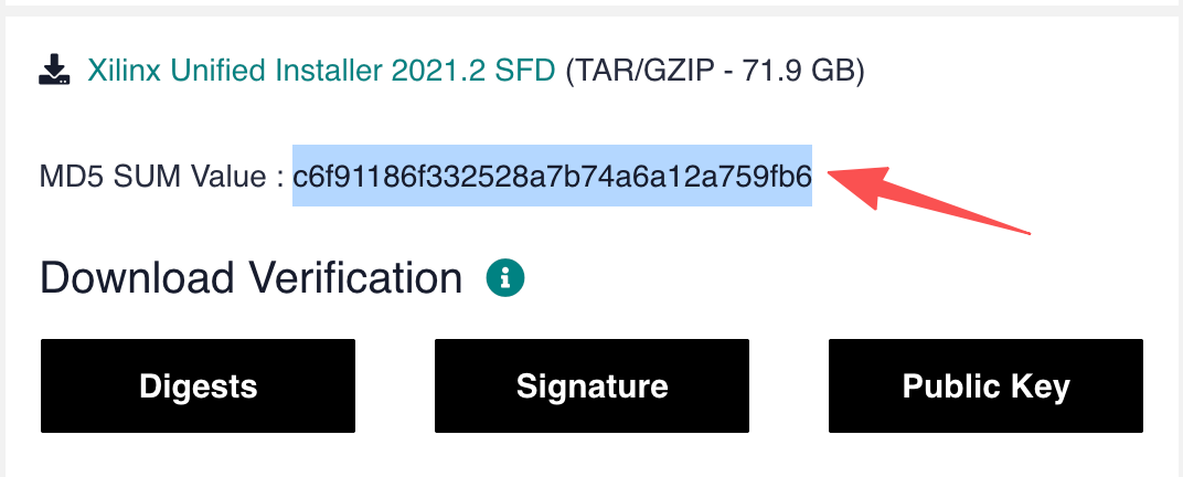 文件名通常是 Xilinx_Unified_2021.2_1021_0703.tar.gz ,在开始之前我们需要对该文件进行下载验证,避免安装包损坏: