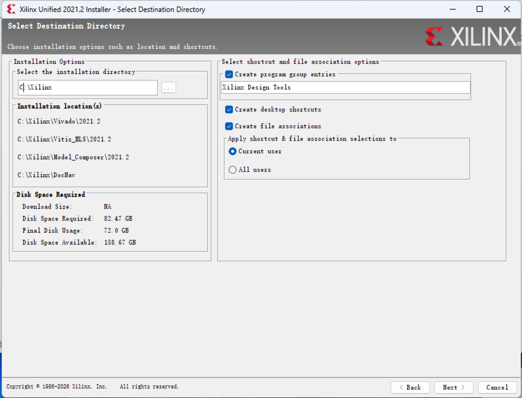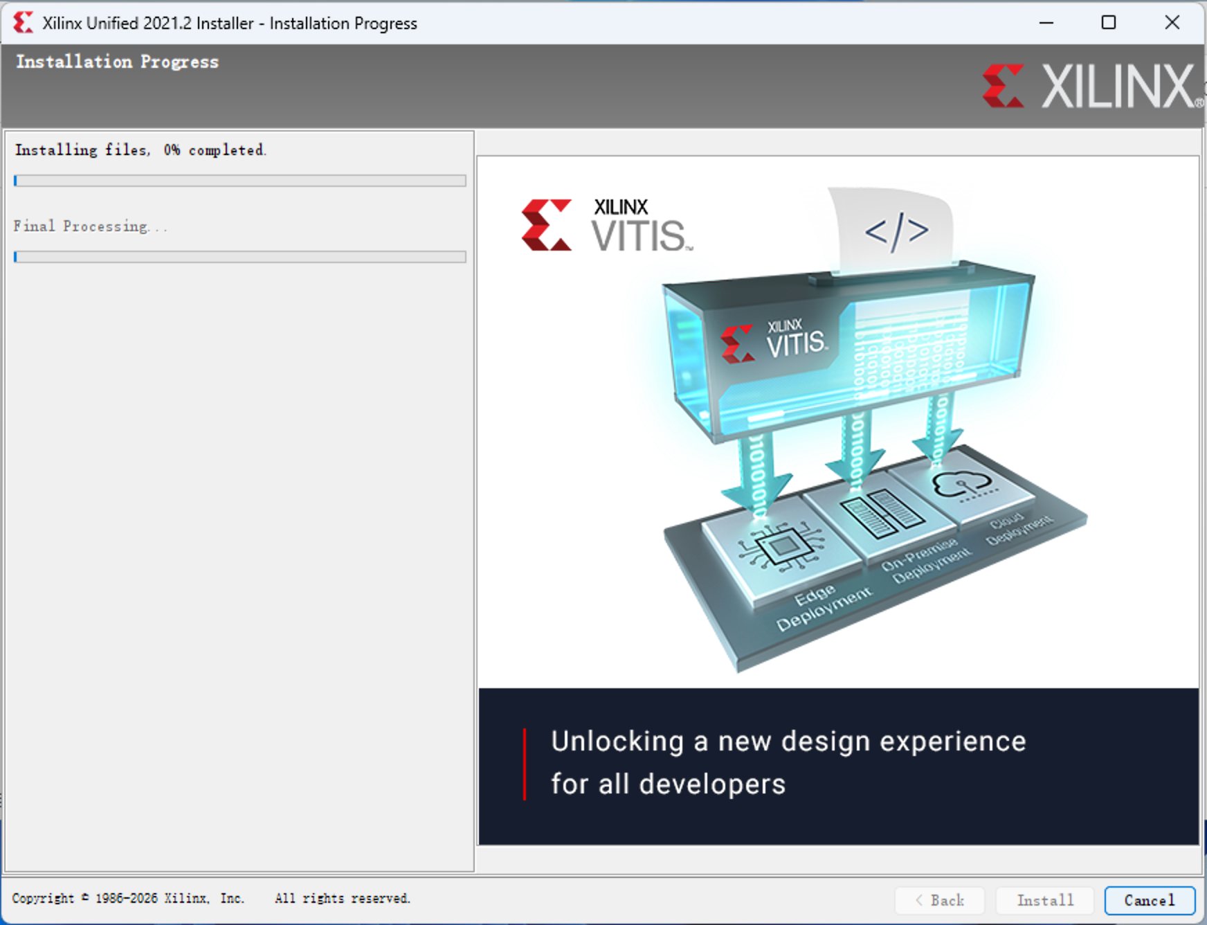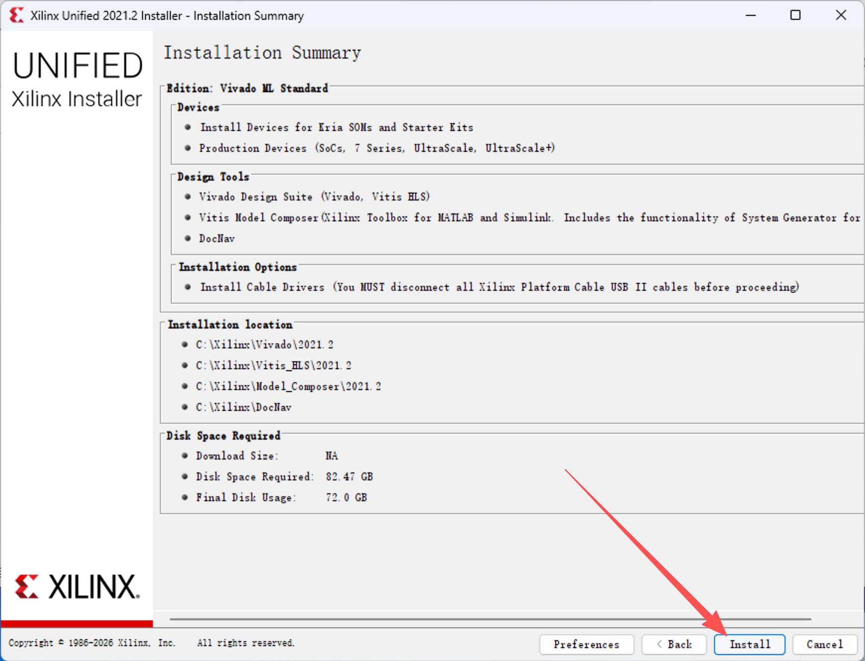 D:\Xilinx路径,这里还需要注意的是当前 PC 的用户名路径也不能是中文且不能包含空格,然后点击 “Next”,再点击 “Install” 就开始安装了,需要一点时间。